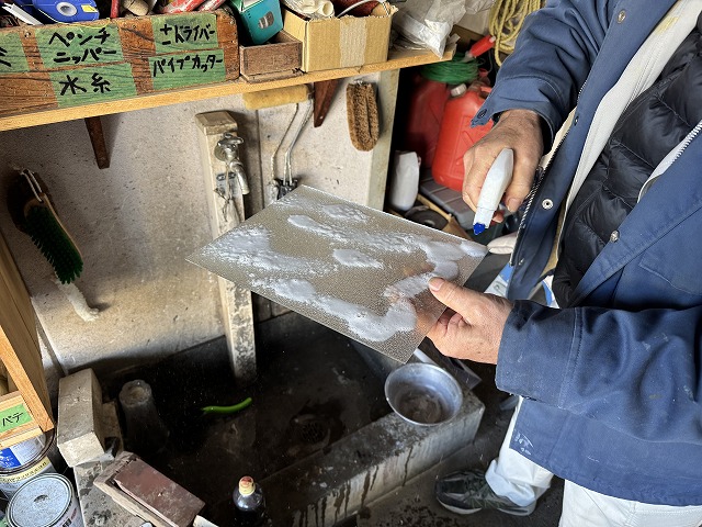 この後、扉に色を付けるのですがホコリをタワシで取っています。