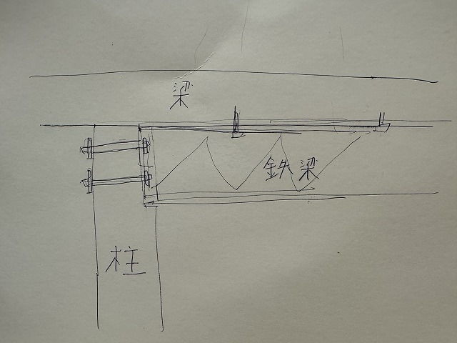 こんな感じで鉄梁を柱に取付けます。